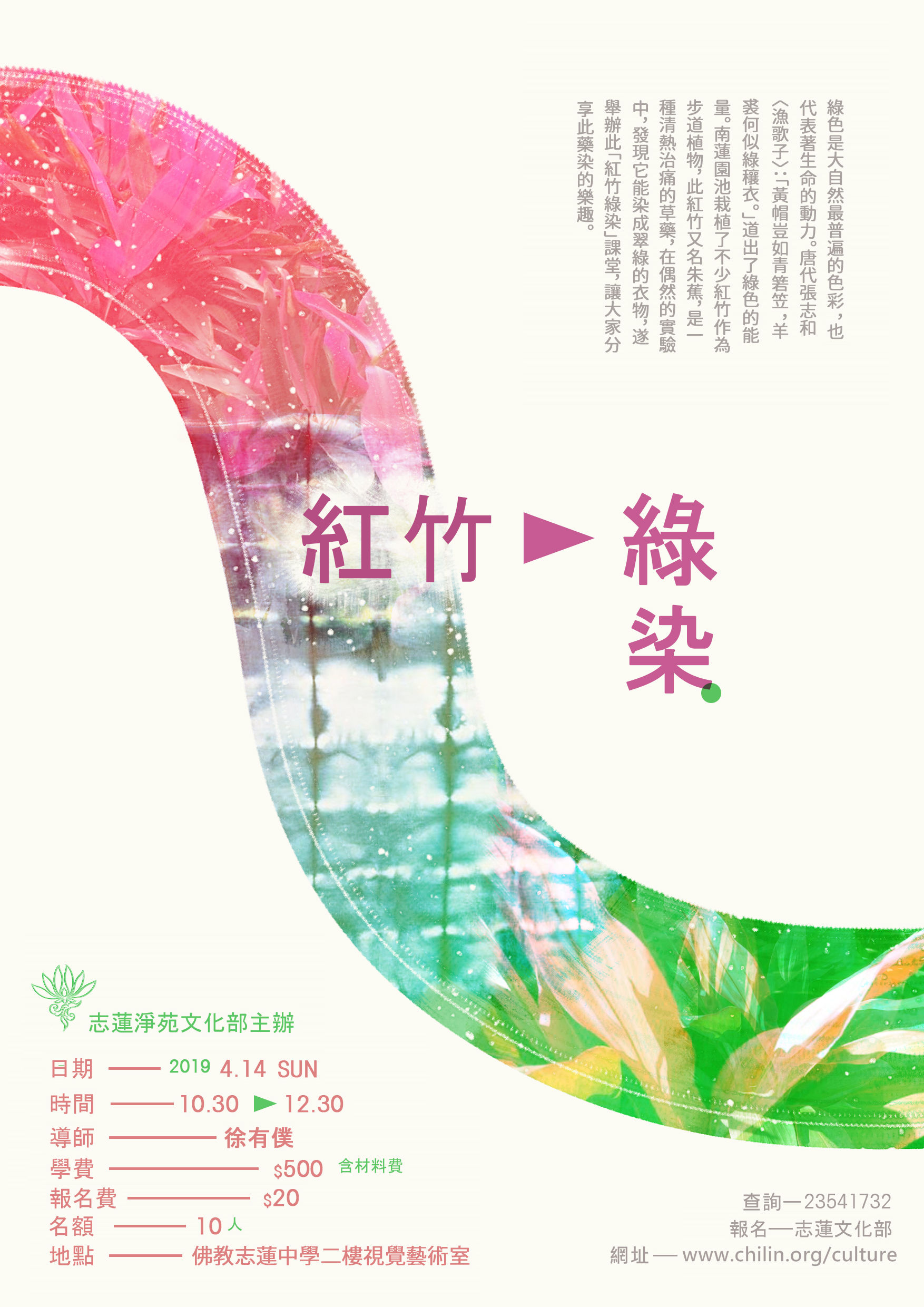 綠色是大自然最普遍的色彩,也代表著生命的動力。唐代張志和<漁歌子>:「黃帽豈如青箬笠,羊裘何似綠穰衣。」道出了綠色的能量。南蓮園池栽植了不少紅竹作為步道植物,此紅竹又名朱蕉,是一種清熱治痛的草藥,在偶然的實驗中,發現它能染成翠綠的衣物,遂舉辦此「紅竹綠染」課堂,讓大家分享此藥染的樂趣。