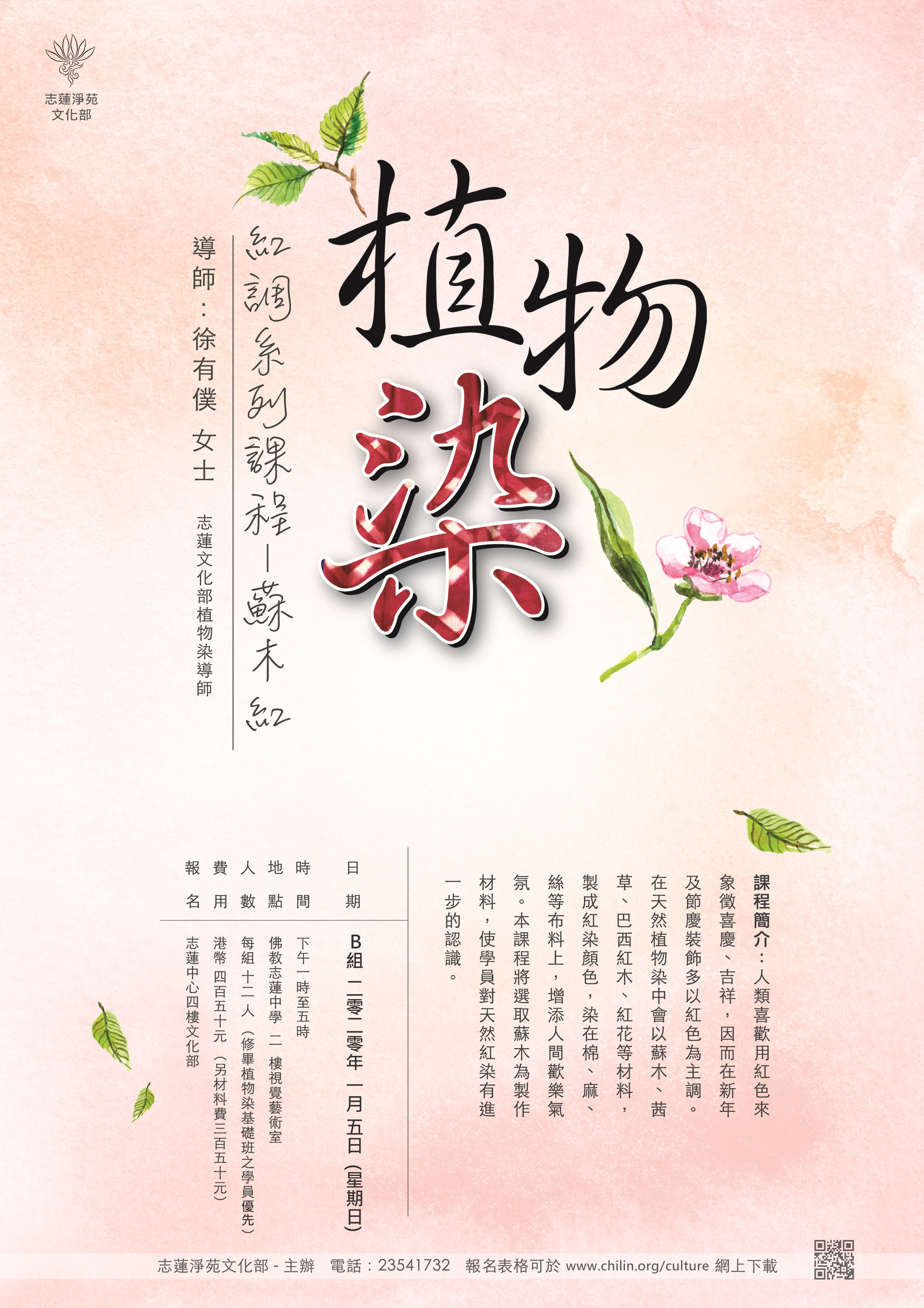 本課程將運用蘇木為原才,配以不同媒染製作,使學員對不同的天然紅染有進一步的認識。