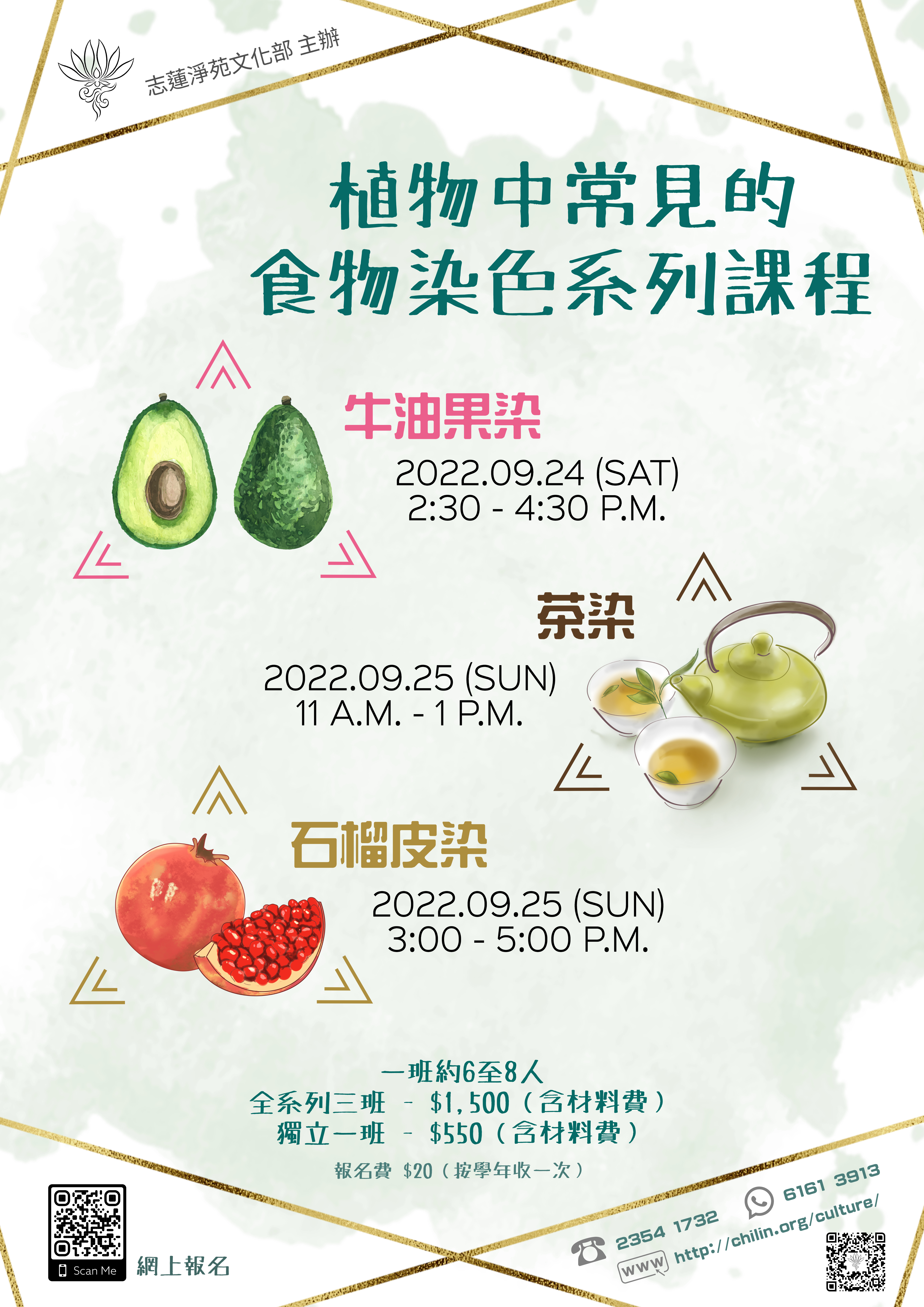 本課程將採用不同的食材作原料,例如咖啡渣、牛油果、茶葉、石榴皮等來講述染料的提取方法,可作布藝創作。