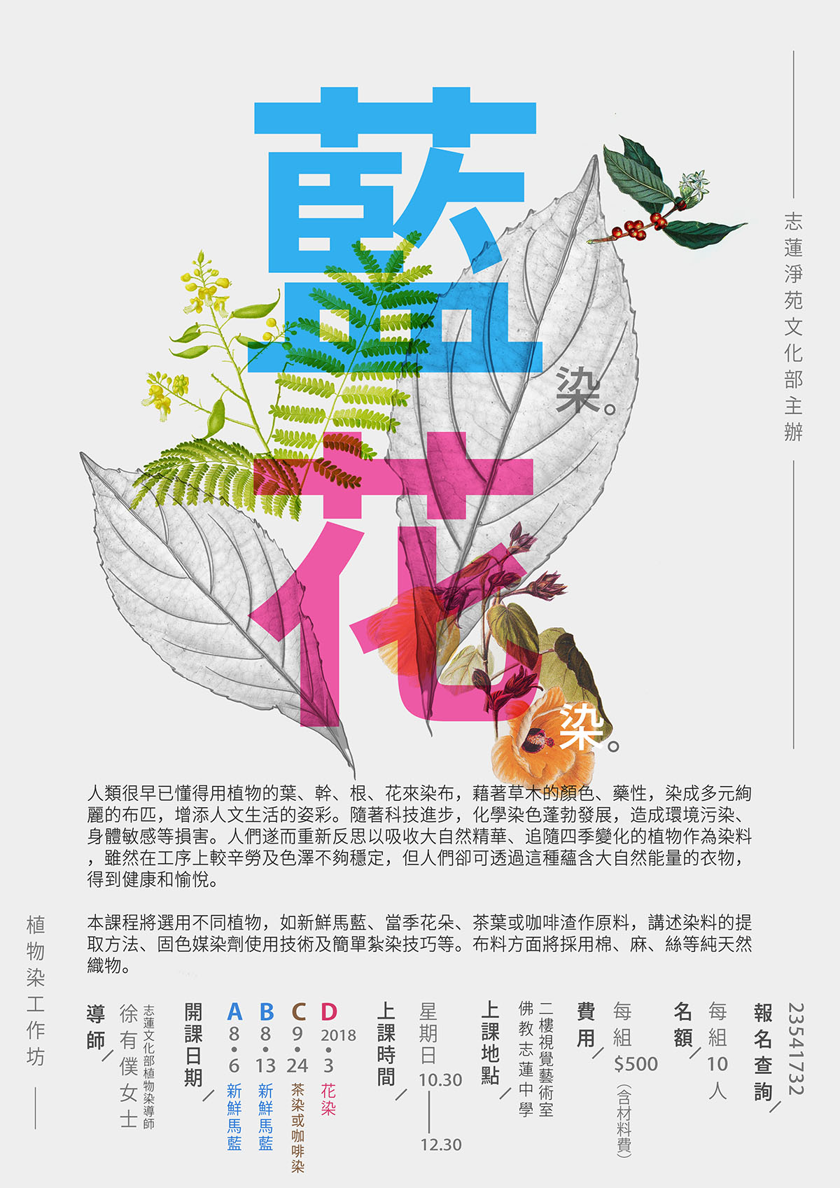 人類很早已懂得用植物的葉、幹、根、花來染布,藉著草木的顏色、藥性,染成多元絢麗的布匹,增添人文生活的姿彩。隨著科技進步,化學染色蓬勃發展,造成環境污染、身體敏感等損害。人們因而重新反思以吸收大自然精華、追隨四季變化的植物作為染料,雖然在工序上較辛勞及色澤不夠穩定,但人們卻可透過這種蘊含大自然能量的衣物,得到健康和愉悅。 本工作坊將選用不同植物,如新鮮馬藍、當季的花朵、茶葉或咖啡渣作原料,講述染料的提取方法、固色媒染劑使用技術及簡單紮染技巧等。布料方面將採用棉、麻、絲等純天然織物。