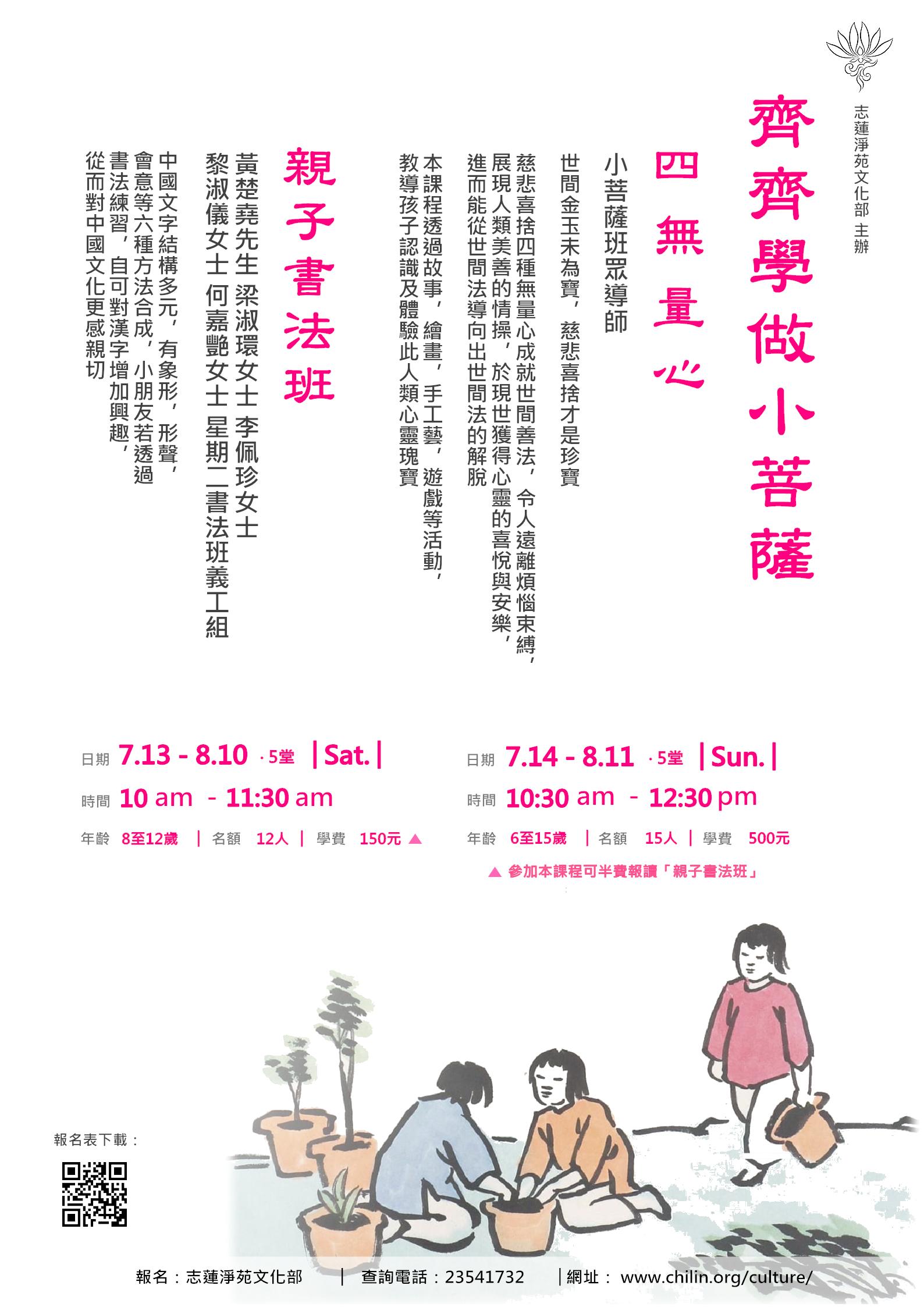 齊齊學做小菩薩之「親子書法班」 中國文字結構多元,有象形、形聲、會意等六種方法合成,小朋友若透過書法練習,自可對漢字增加興趣,從而對中國文化更感親切。 導 師: 本院眾導師 導師簡介: 黃楚堯先生、梁淑環女士、李佩珍女士、黎淑儀女士、何嘉艷女士、星期二書法班義工組 課程編號:S610 開課日期:2019年07月13日 上課時間:逢星期六 上午10:00-11:30 上課地點:志蓮淨苑中心四樓 堂 數:約5堂 名 額:約12人 學 費:$150 課程對象:8-12歲 學員自備: