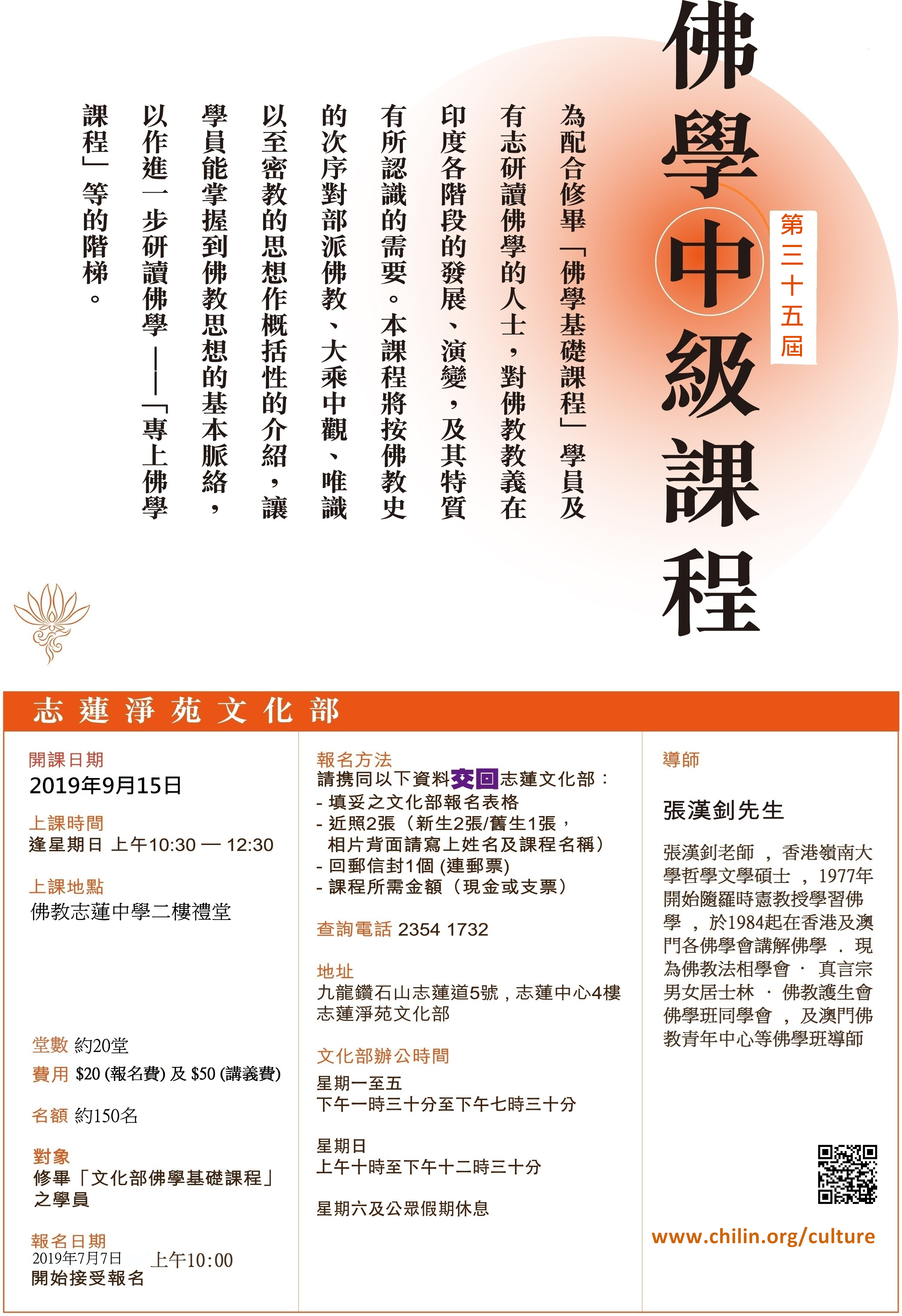 為配合修畢「佛學基礎課程」學員及有志研讀佛學的人士,對佛教教義在印度各階段的發展、演變及其特質有所認識的需要。本課程將按佛教史的次序對部派佛教、大乘中觀、唯識以至密教的思想作概括性的介紹,讓學員能掌握到佛教思想的基本脈絡,以作進一步研讀佛學──「專上佛學課程」等的階梯。