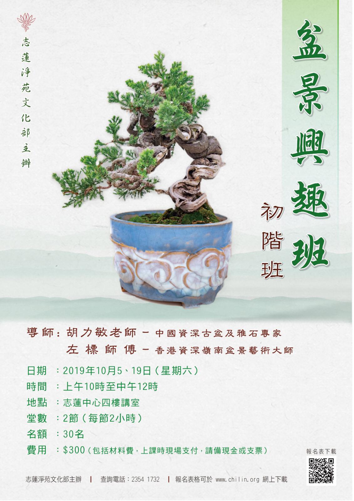 盆景興趣班 - 初階班 日期:2019年10月19日、11月2日(星期六) 費用含材料費,可於上課時備現金或支票現場支付 導 師: 本院眾導師 導師簡介: 胡力敏老師 - 中國資深古盆及雅石專家 左標師傅 - 香港資深嶺南盆景藝術大師 課程編號:C610B 開課日期:2019年10月19日 上課時間:逢星期六 上午10:00-12:00 上課地點:志蓮淨苑中心四樓 堂 數:2節 (每節2小時) 名 額:30名 學 費:$300(含材料費) 課程對象: 學員自備: