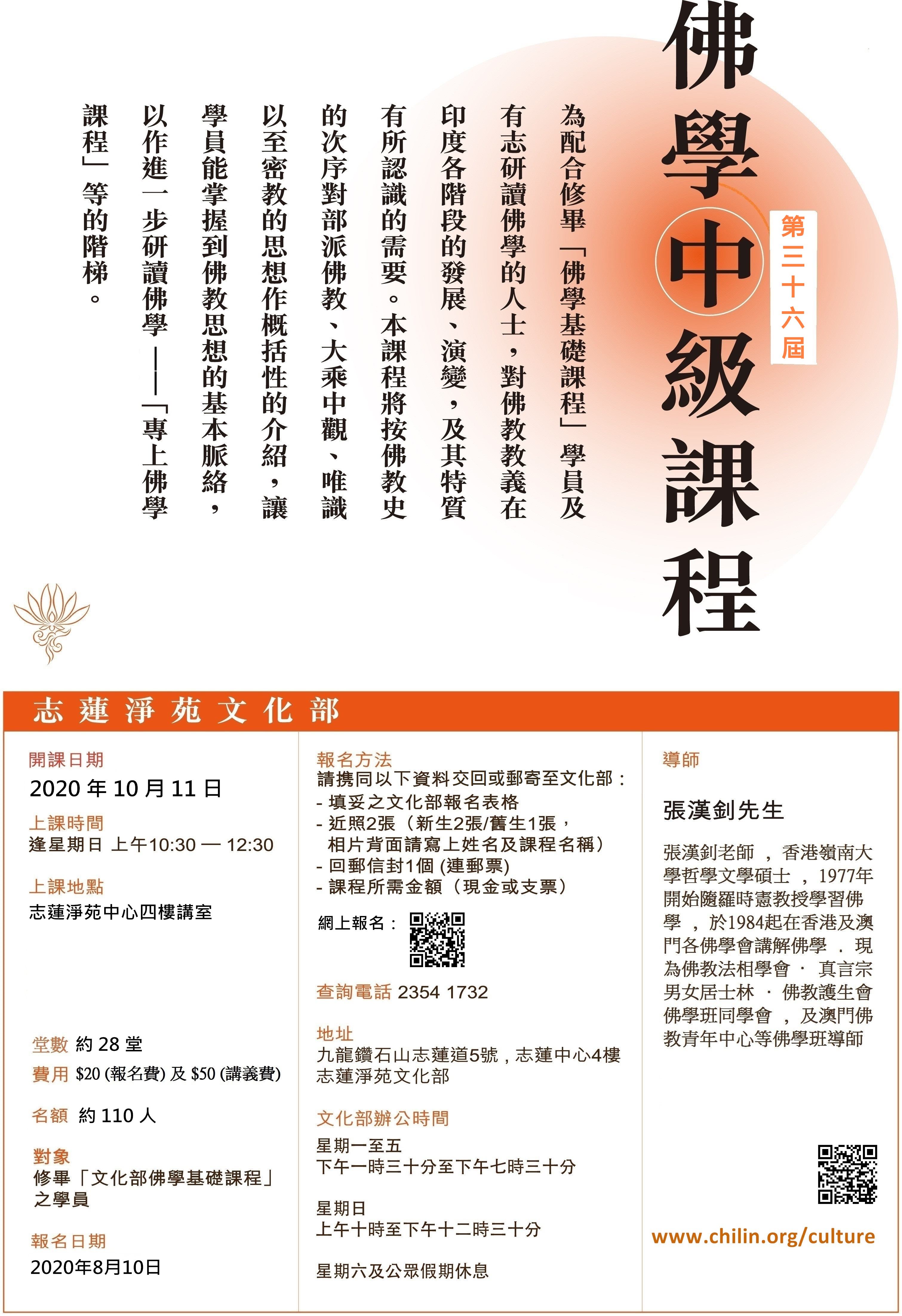 為配合修畢「佛學基礎課程」學員及有志研讀佛學的人士,對佛教教義在印度各階段的發展、演變及其特質有所認識的需要。本課程將按佛教史的次序對部派佛教、大乘中觀、唯識以至密教的思想作概括性的介紹,讓學員能掌握到佛教思想的基本脈絡,以作進一步研讀佛學──「專上佛學課程」等的階梯。