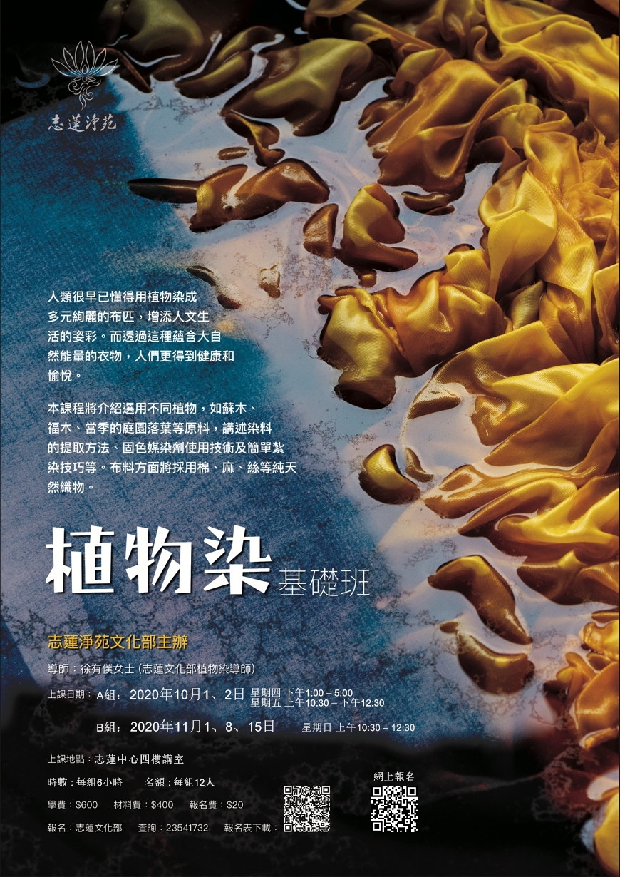 本課程將介紹選用不同植物,如蘇木、福木、當季的庭園落葉及藍泥、咖啡渣等作原料,講述染料的提取方法、固色媒染劑使用技術及簡單紮染技巧等。布料方面將採用棉、麻、絲等純天然織物。