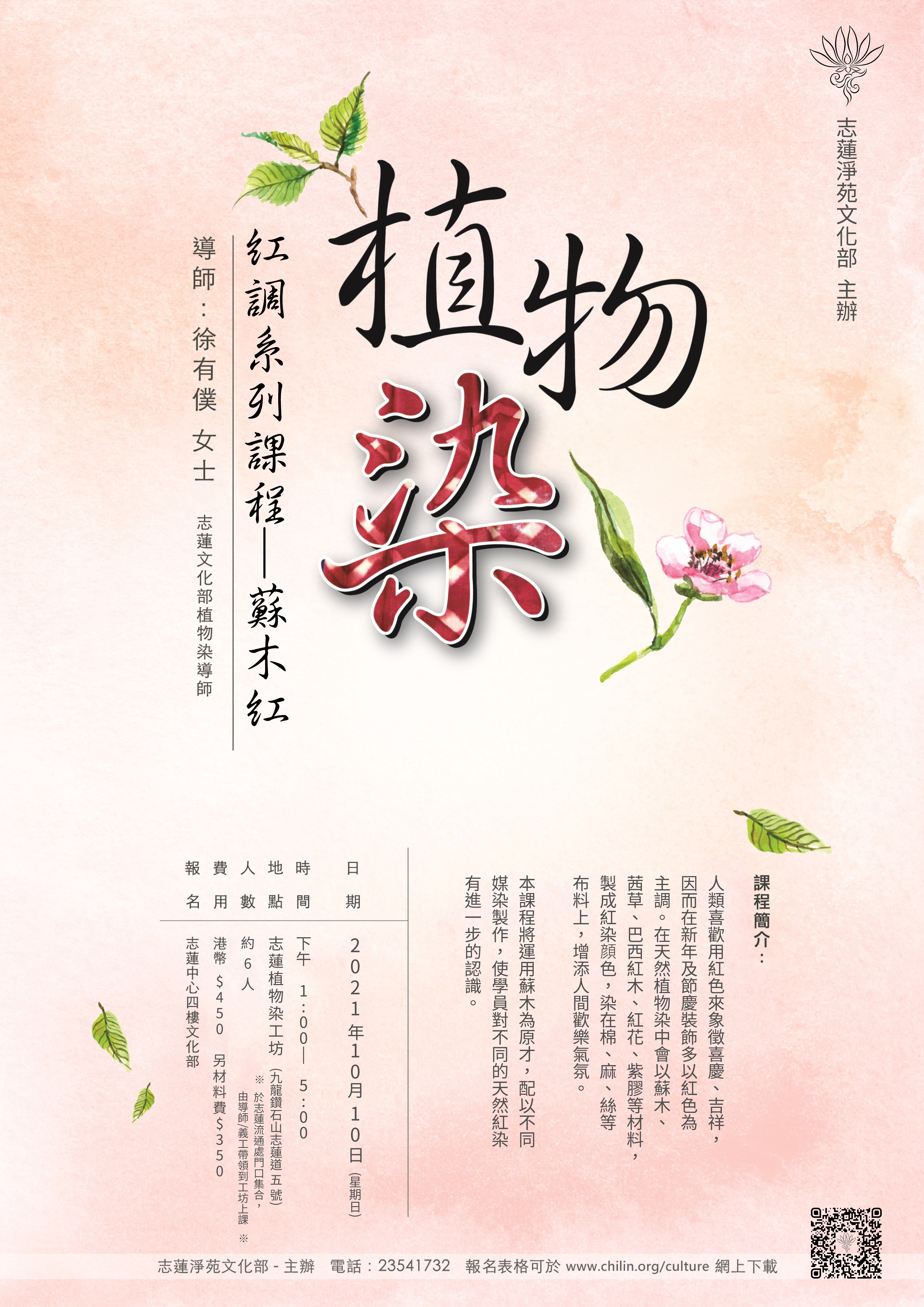 人類喜歡用紅色來象徵喜慶、吉祥,因而在新年及節慶裝飾多以紅色為主調。在天然植物染中會以蘇木、茜草、巴西紅木、紅花、紫膠等材料,製成紅染顔色,染在棉、麻、絲等布料上,增添人間歡樂氣氛。 本課程將運用蘇木為原才,配以不同媒染製作,使學員對不同的天然紅染有進一步的認識。 ※※ 因場地調動,課程改在10月31日舉行 ※※