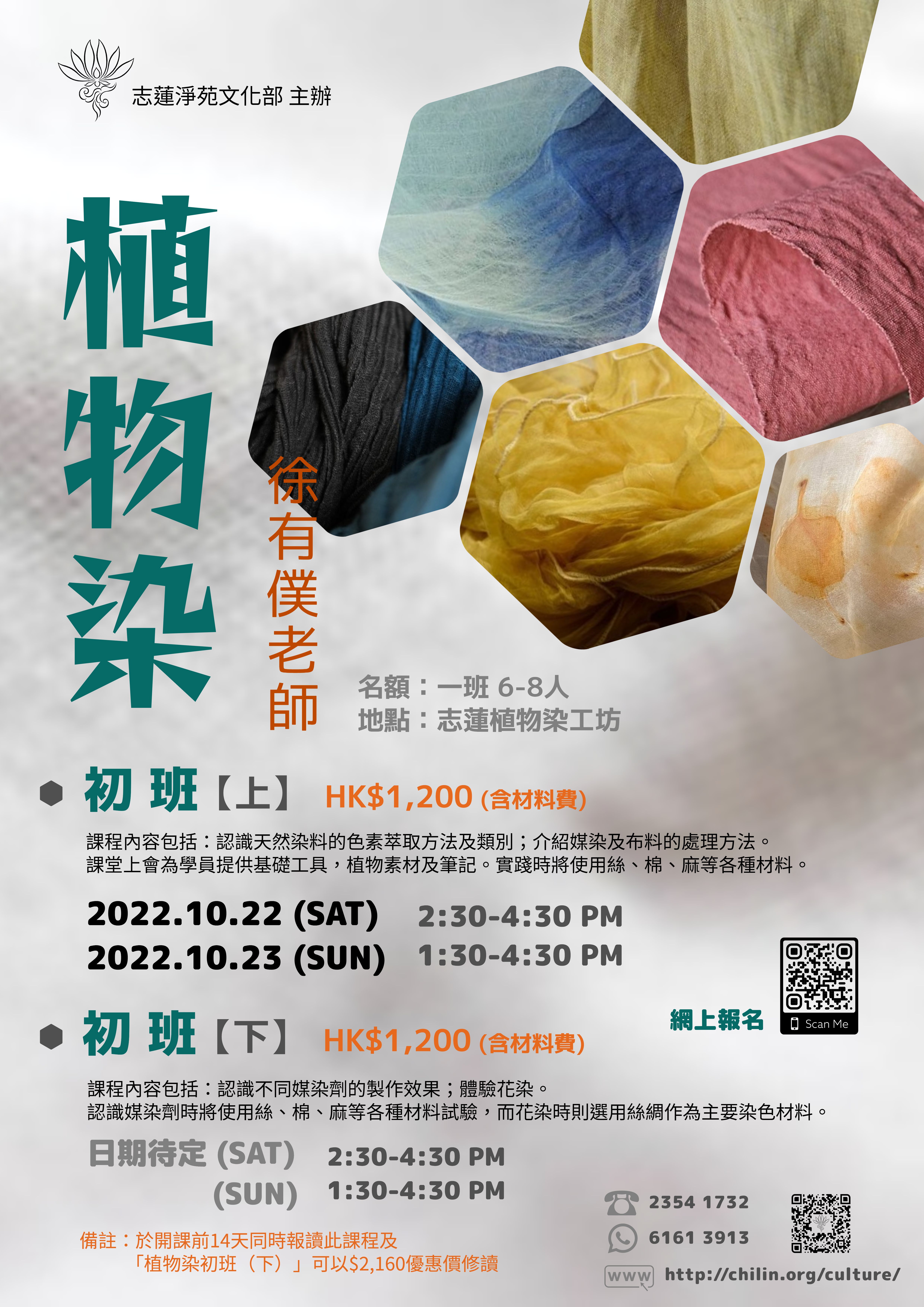 備 註:於開課前14天同時報讀此課程及「植物染初班(下)」可以$2,160優惠價修讀