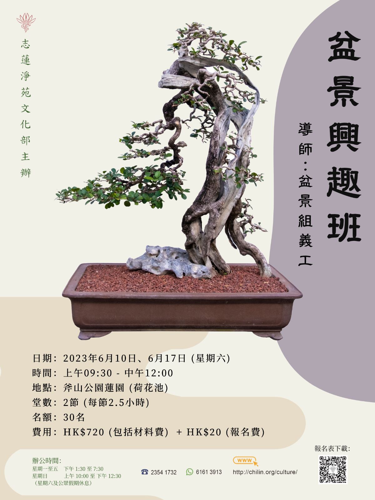 盆景興趣班(2023) 上課日期 :2023年6月10日、17日(星期六) 導 師: 本院眾導師 導師簡介: 盆景組義工 課程編號:C610C 開課日期:2023年06月10日 上課時間:星期六 上午9:30-12:00 上課地點:斧山公園蓮園 (荷花池) 堂 數:2節(每節2.5小時) 名 額:約30人 學 費:$720(含材料費) 課程對象: 學員自備: