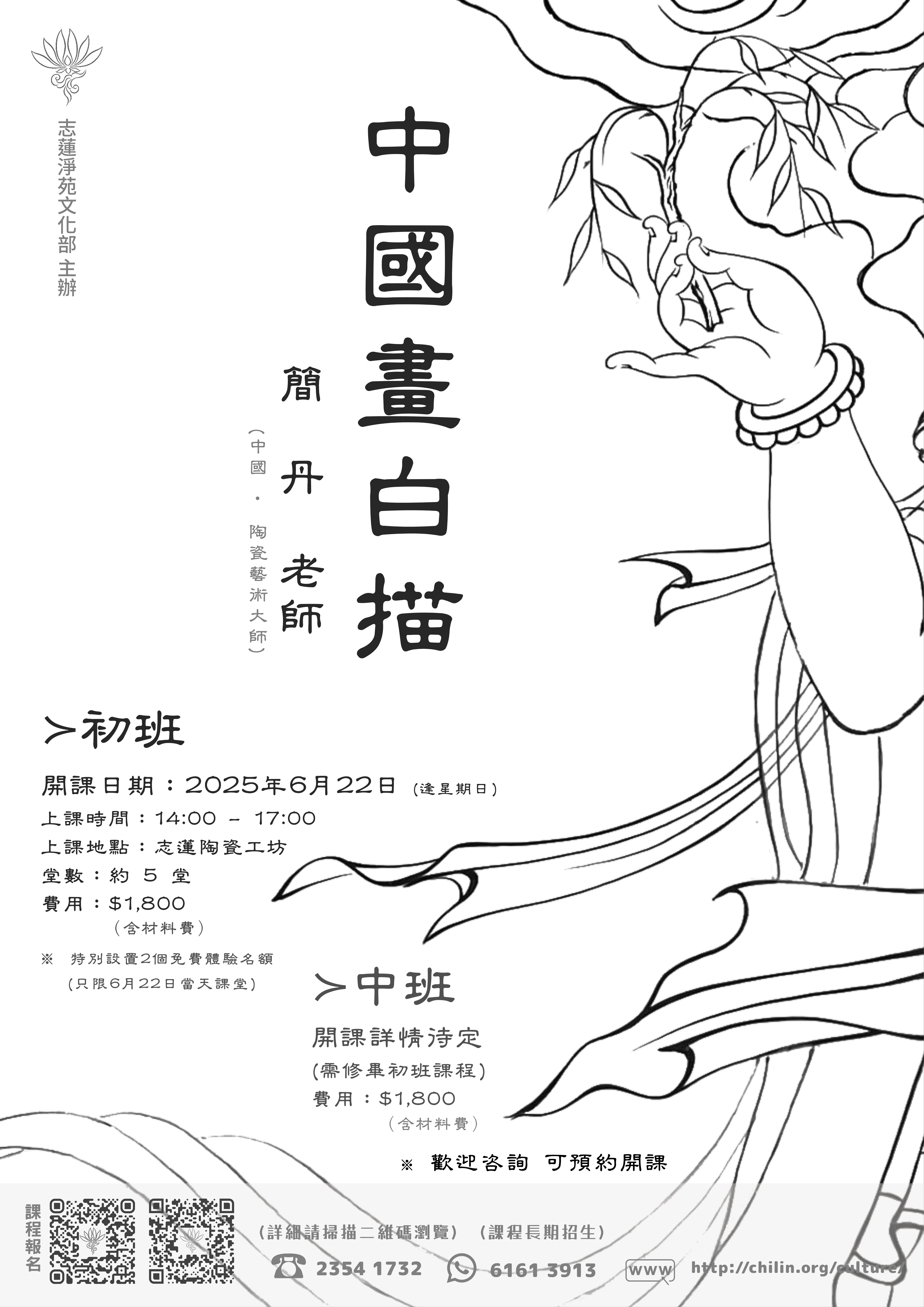 白描是一種具有明確定義和特色的技法與表現方法,在繪畫領域,白描是中國畫技法名,指單用墨色線條勾描形象而不加藻飾、渲染烘托的畫法。它強調以線條為主要表現手段,通過線條的粗細、輕重、曲直、疏密等變化來描繪物像。在文學領域,白描也是一種表現手法,主要用樸素簡練的文字描述形象,文字簡練樸素,不加渲染,直接描述來表現人物,場景和事件。整套課程分初、中、高班三個階段學習。