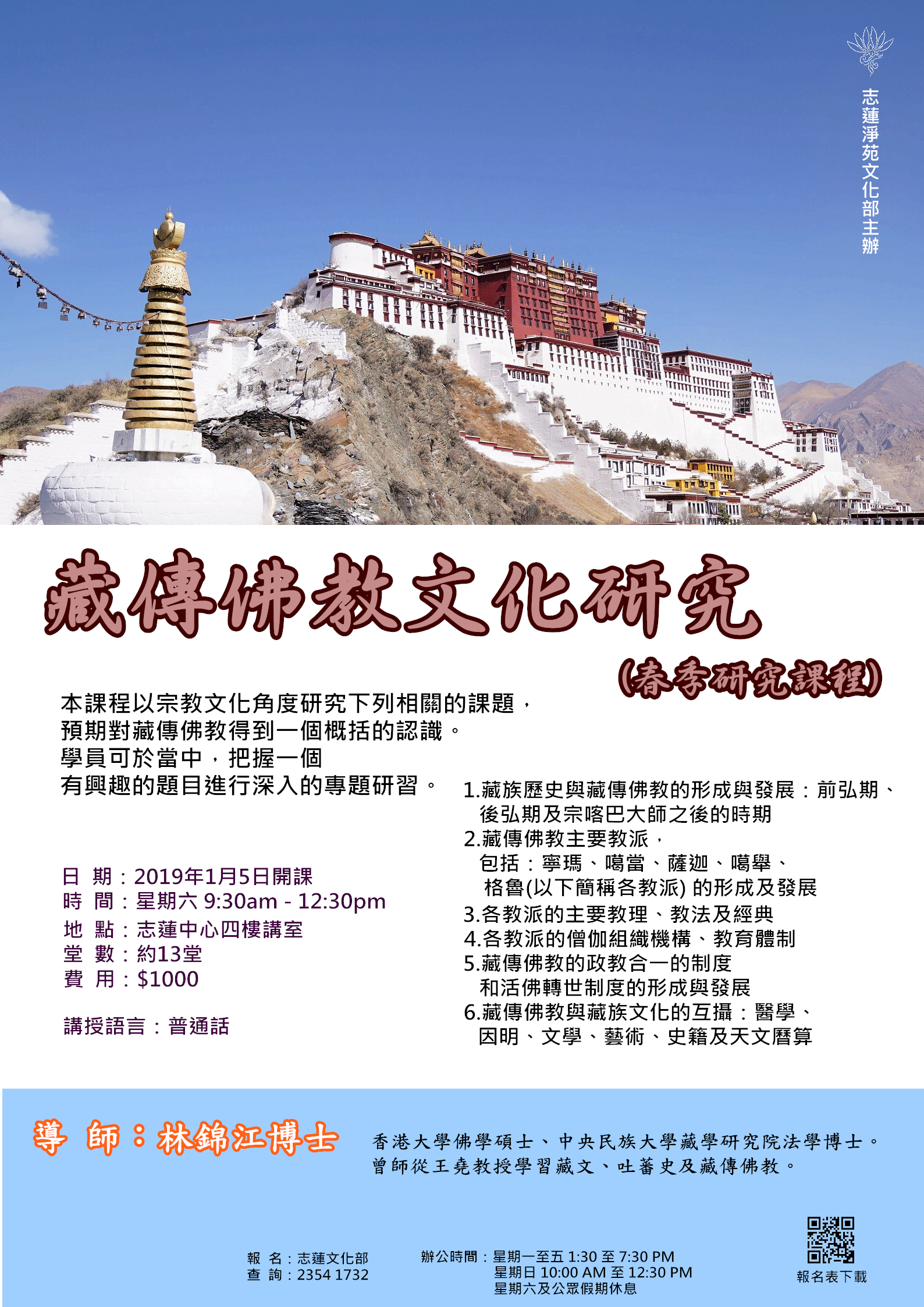本課程以宗教文化角度研究下列相關的課題,預期對藏傳佛教得到一個概括的認識。 學員可於當中,把握一個有興趣的題目進行深入的專題研習。 1.藏族歷史與藏傳佛教的形成與發展:前弘期、後弘期及宗喀巴大師之後的時期 2.藏傳佛教主要教派,包括:寧瑪、噶當、薩迦、噶舉、格魯(以下簡稱各教派) 的形成及發展 3.各教派的主要教理、教法及經典 4.各教派的僧伽組織機構、教育體制 5.藏傳佛教的政教合一的制度和活佛轉世制度的形成與發展 6.藏傳佛教與藏族文化的互攝:醫學、因明、文學、藝術、史籍及天文曆算 *(泰國國際佛教大學學員修畢可獲3學分) **課程將以普通話授課