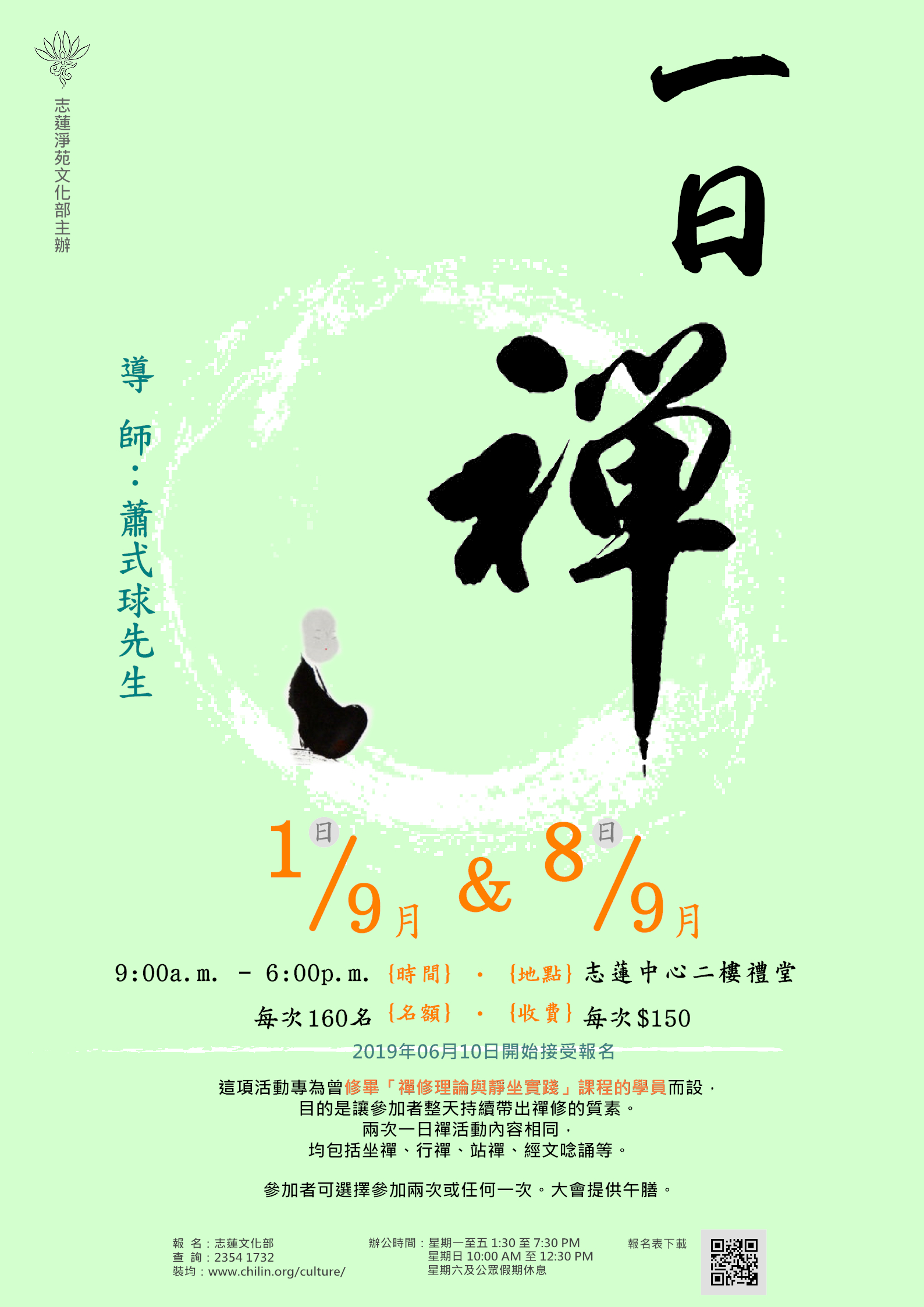 這項活動專為曾修畢「禪修理論與靜坐實踐」課程的學員而設,目的是讓參加者整天持續帶出禪修的質素。兩次一日禪活動內容相同,均包括坐禪、行禪、站禪、經文唸誦等。參加者可選擇參加兩次或任何一次。有興趣人士請到文化部辦事處報名。(會由大會提供午膳。) *2019年6月1日 開始接受報名,報名無需照片。