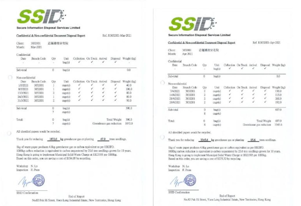為配合環保,本院於2021年2月8日開始與資訊機密處理有限公司合作,進行廢紙回收工作,流程大致順利。行政部會繼續跟進了解,務求令環保工作更全面。