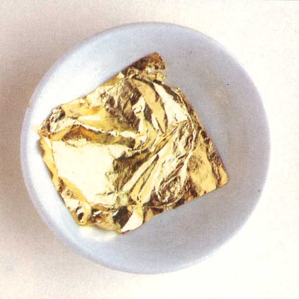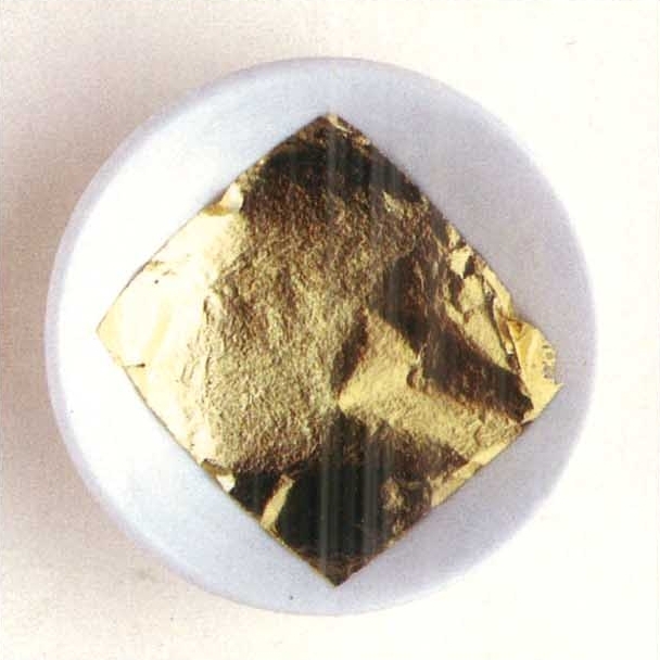 金:呈赤黃色之金屬,故亦稱黃金,主要混存於石英及沙中,其質柔輙。塑像和繪畫用的金,都是將之錘成金箔用的。黃金的顏色,被稱爲百色之光,與任何顏色都相協調。大赤是金的本色,另外有淡黃色的名田赤;而入銅即成紅金(見右圖),入銀則成靑金(見左圖)。