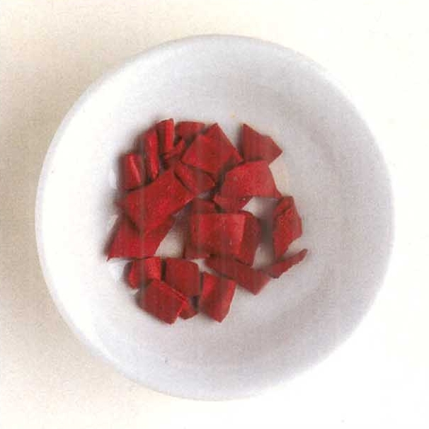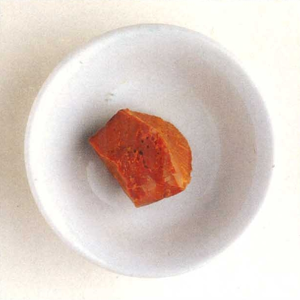 朱砂:又名丹砂,屬於輝閃礦類,生在石灰岩中,色緋紅,呈塊、柱、板、箭頭等形,以箭頭狀的爲優,乃提煉水銀的主要礦物。據《本草綱目》 載:「丹乃石名,其字從井中一點,象丹在井中之形……後人以丹爲朱色之名,故呼朱砂。」